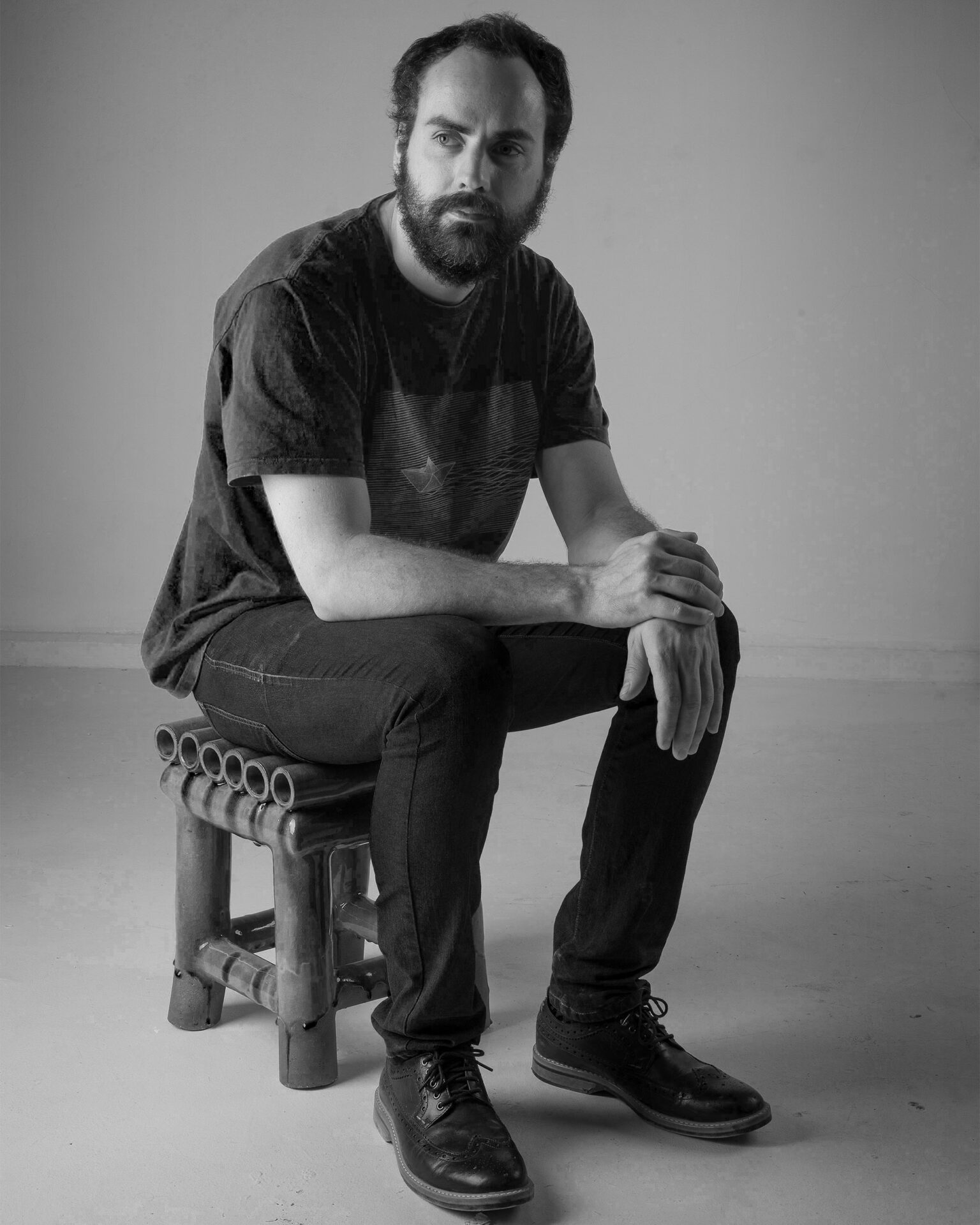 Classical architecture is also reimagined in soft clay: Greek columns with lopsided profiles can be used as a seat, stool or plinth – further blurring the distinction between the functional object and sculptural form. Extruded from a custom-made machine, the regularity and perfection of the column is disturbed, and their glazed surfaces come in many colours and textures – some coated with thick, shiny colour, whilst others are dappled and grainy, translucent and thin.