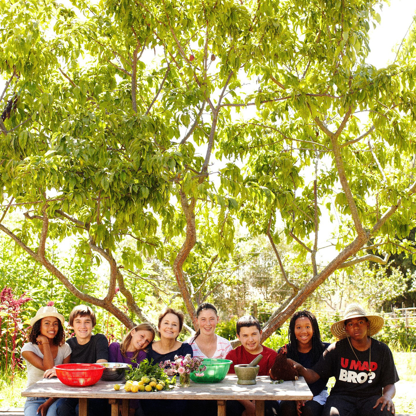 Alice Waters and students gathered in the garden, surrounded by harvest and shade.