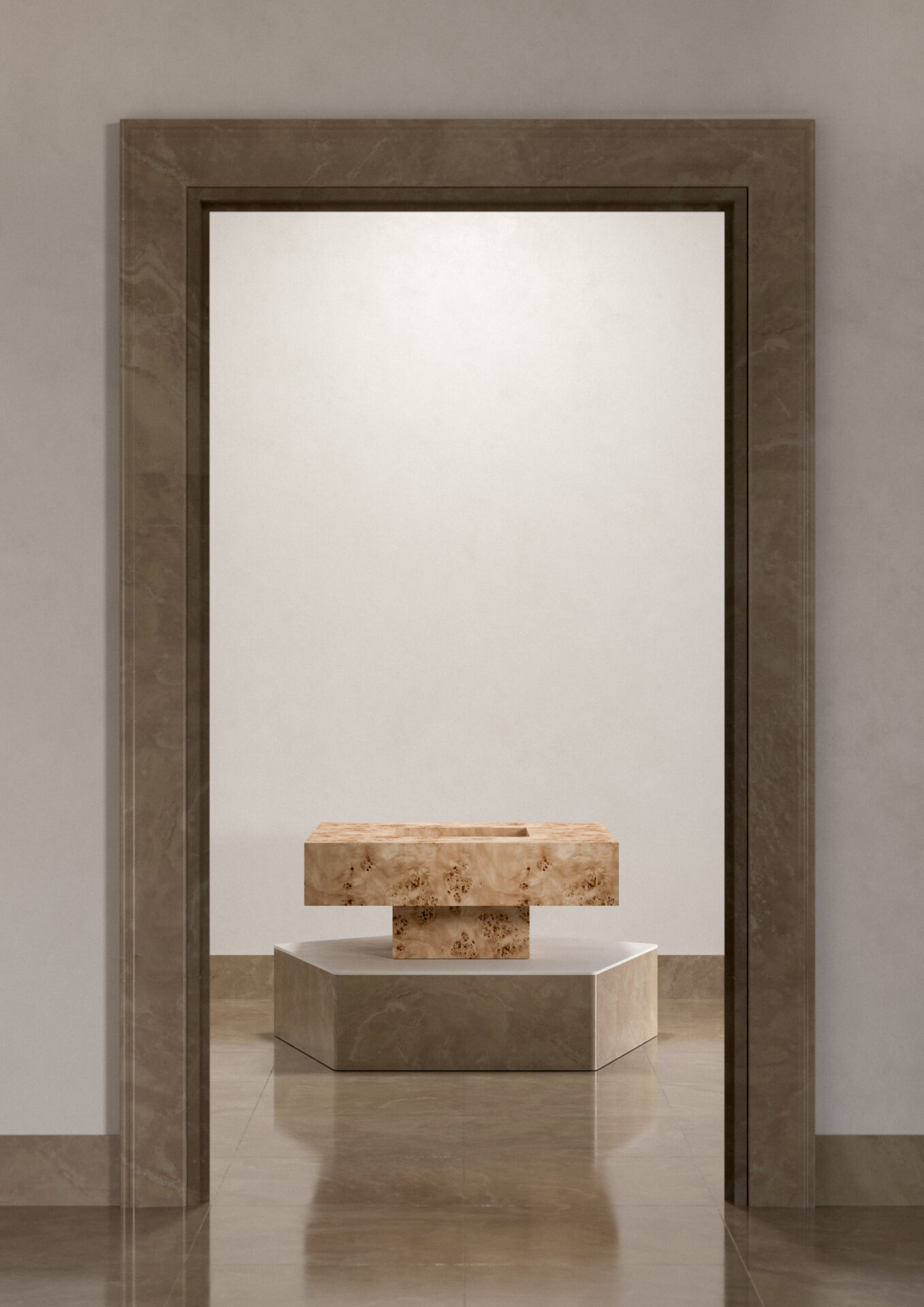 The designer’s debut piece set the tone: a low, geometric coffee table with a central “pit” carved into the surface. It’s a striking void that invites use—storage for books, flowers, or simply empty space. “I wanted to add functionality without disturbing the purity of the form,” she says. That dialogue between sculptural precision and domestic warmth defines much of her work.