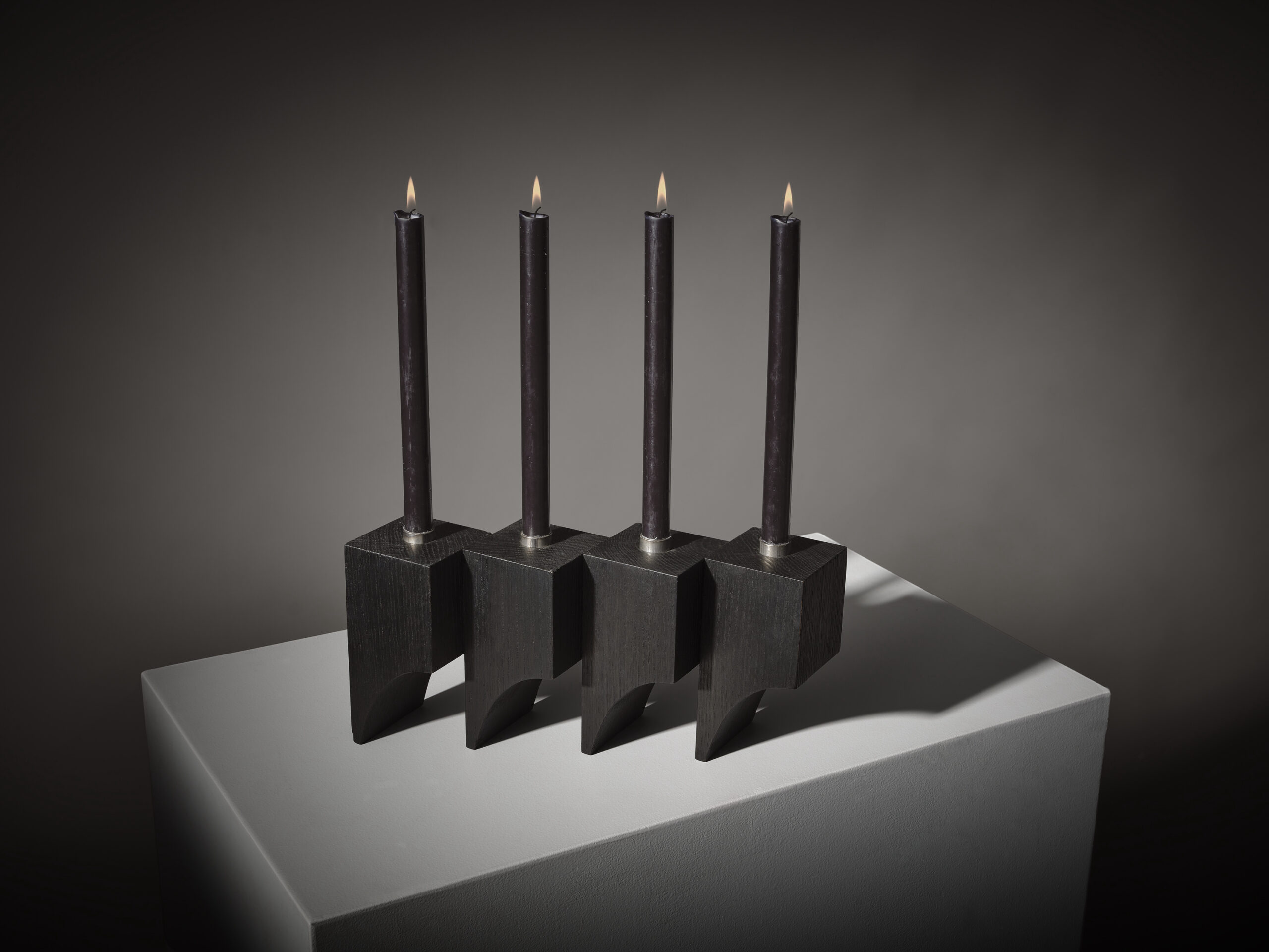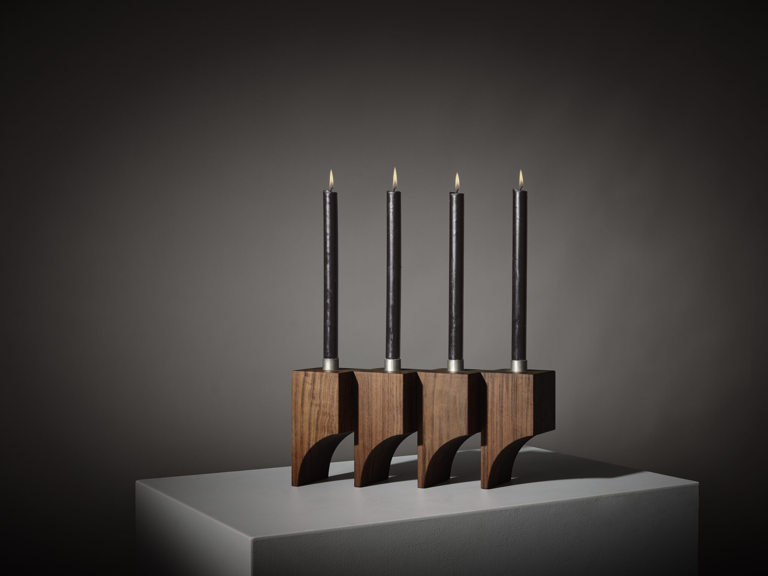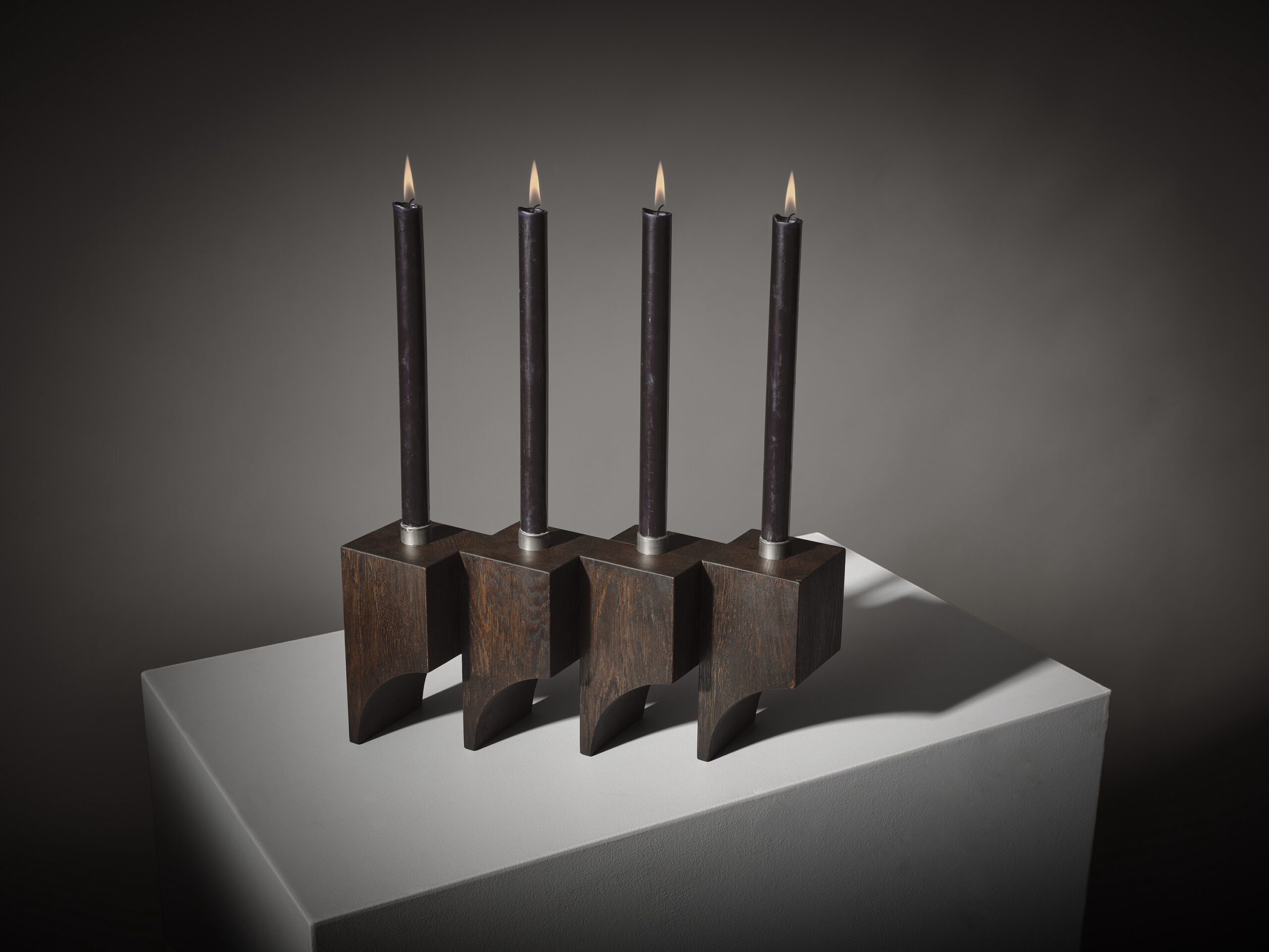 The Acer candle holder R:4 features a rhythmic sequence of architectural cubic volumes and semi arched voids. Made out of solid wood and steel, showing signs of handcraft.