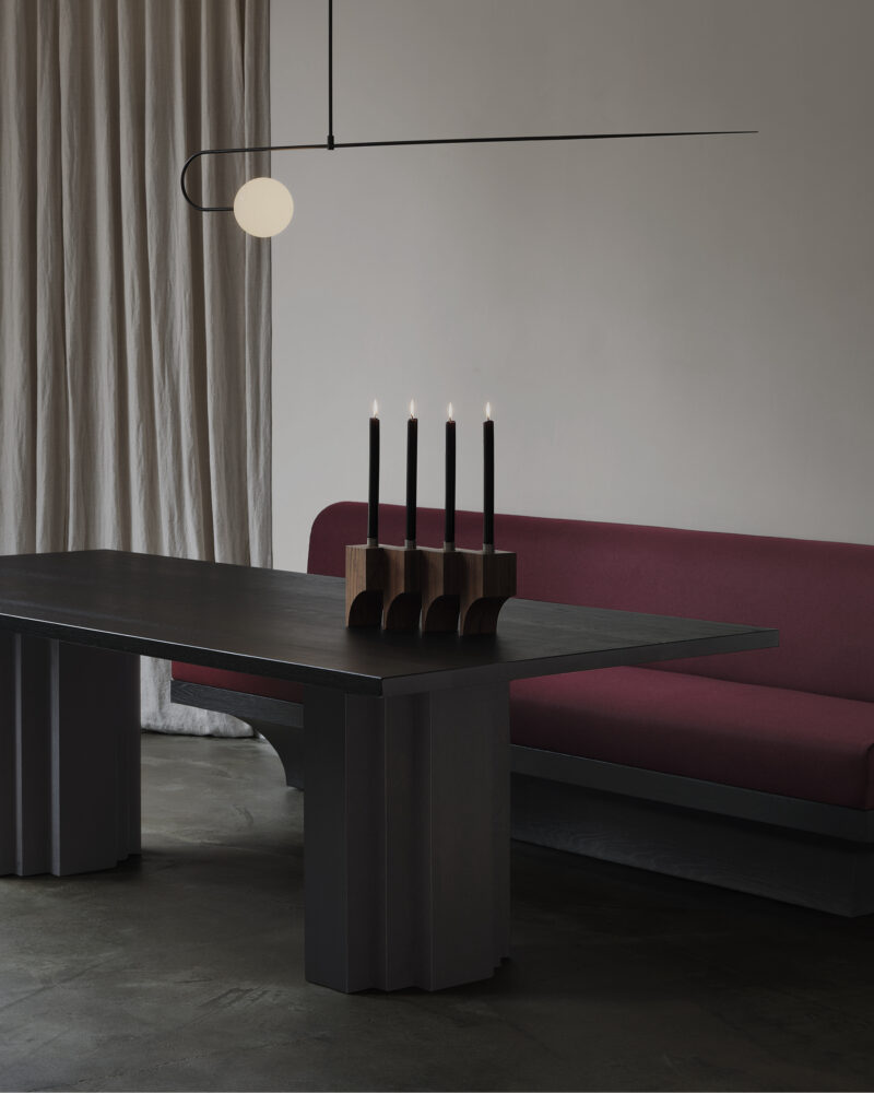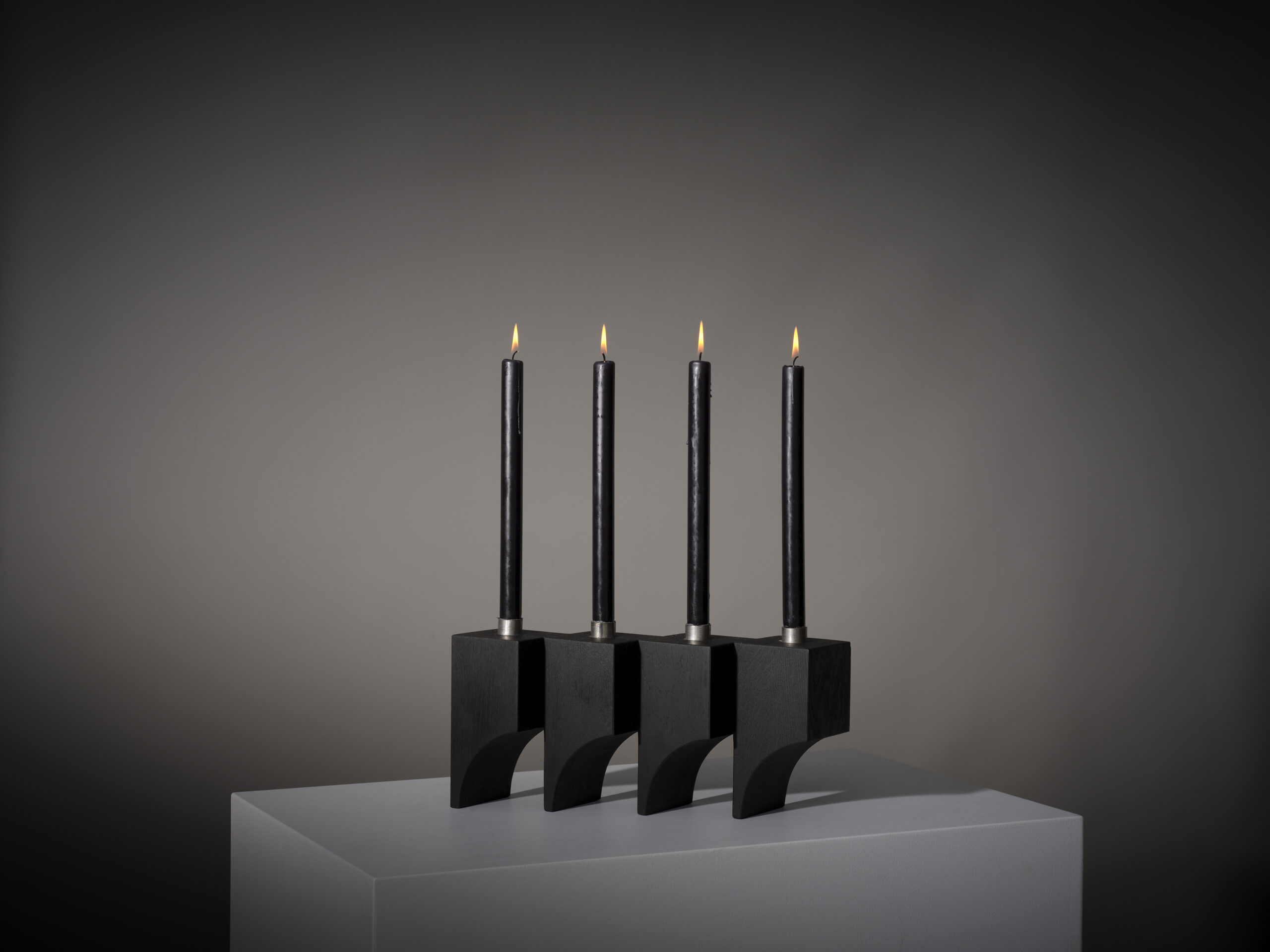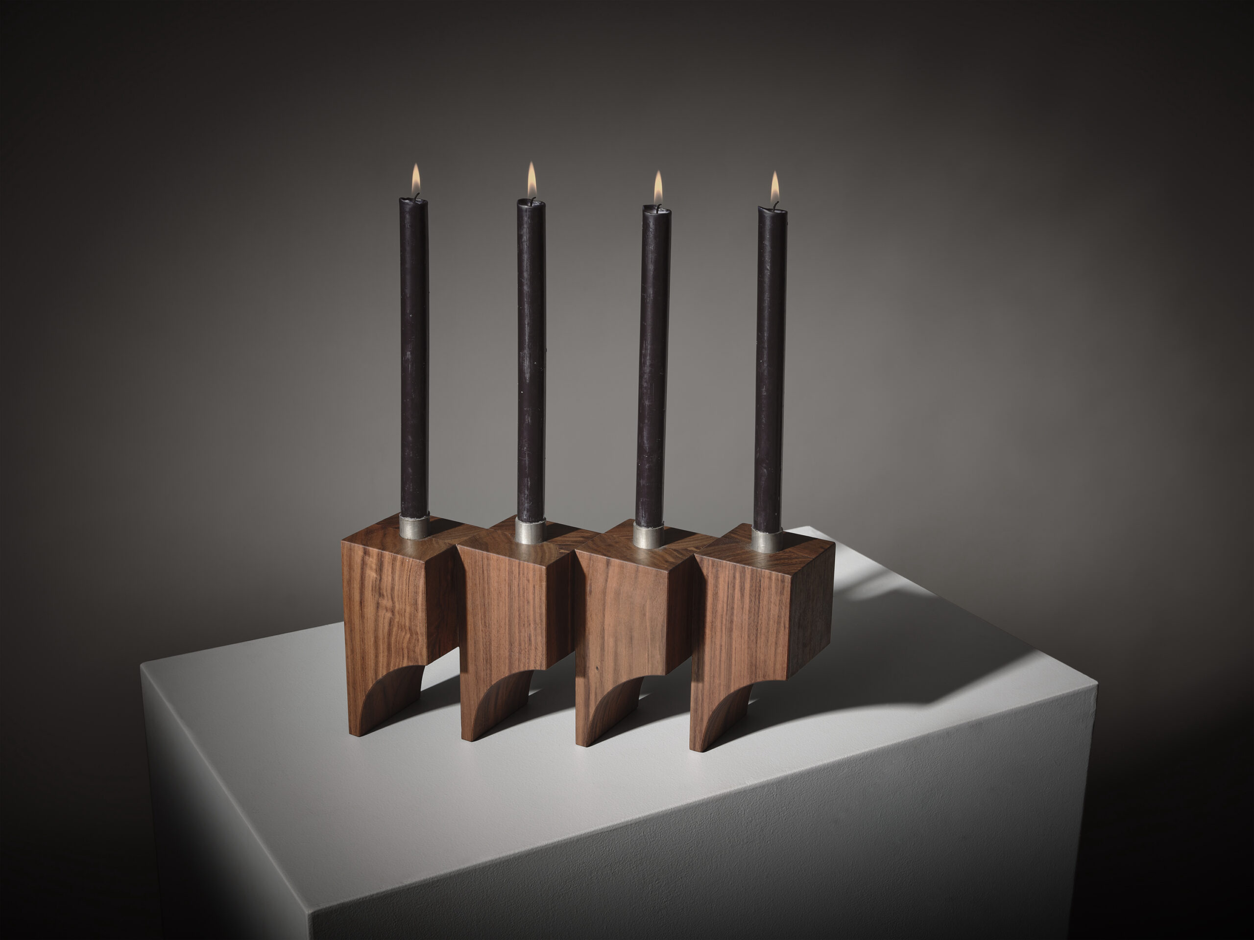The Acer candle holder R:4 features a rhythmic sequence of architectural cubic volumes and semi arched voids. Made out of solid wood and steel, showing signs of handcraft.