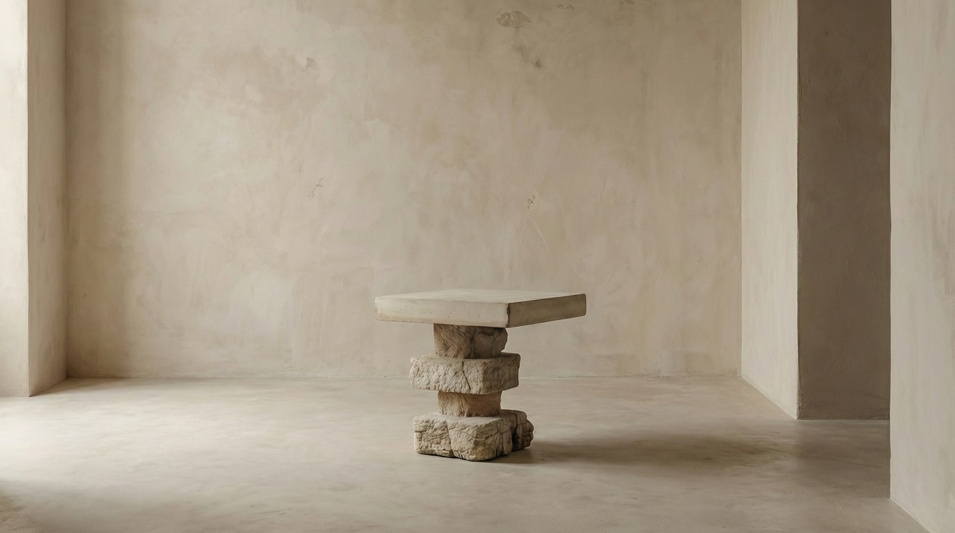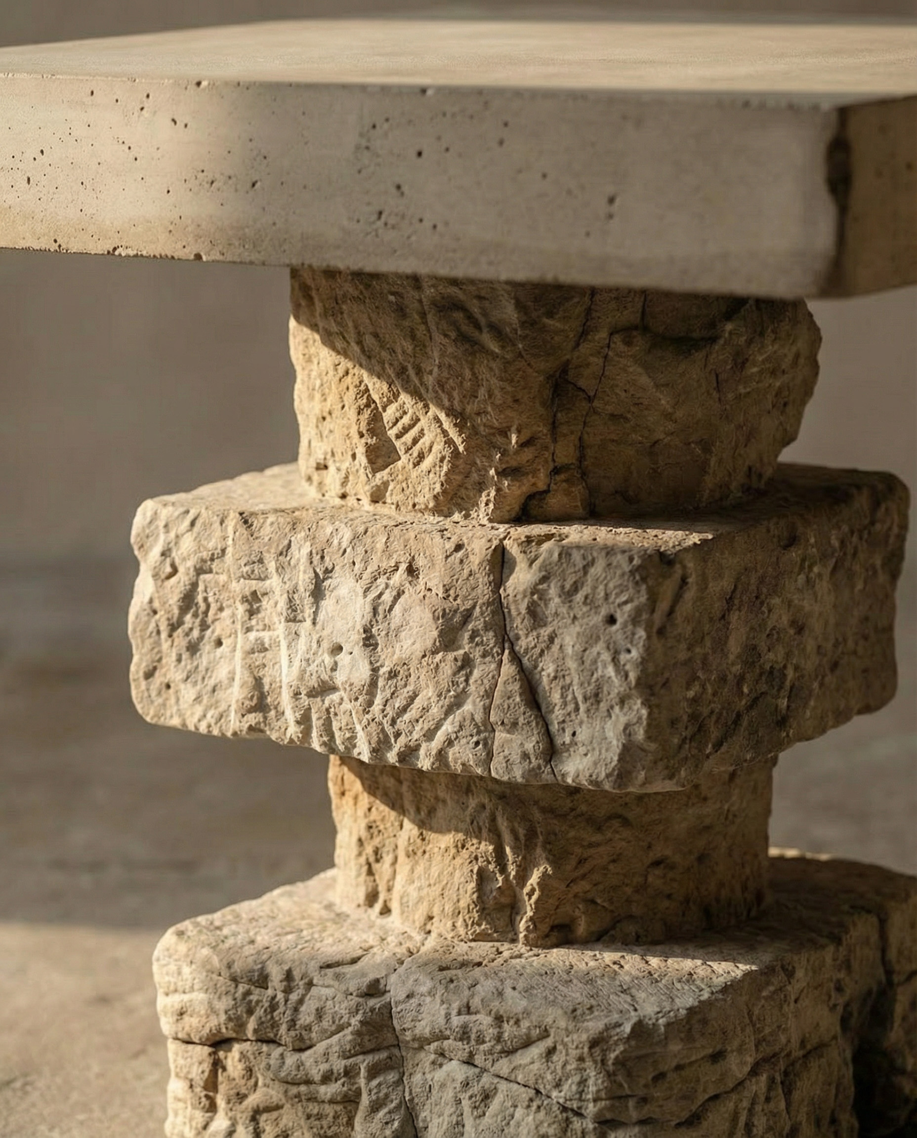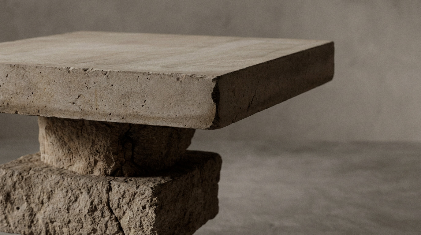 Light rests differently on Aitear. A broad planar top hovers above a stacked travertine base, creating quiet tension between weight and levity. The name — meaning sky — reflects this upward draw, where mass meets air. Used beside seating or as standalone object, Aitear offers balance and proportion, permanence softened by lift.