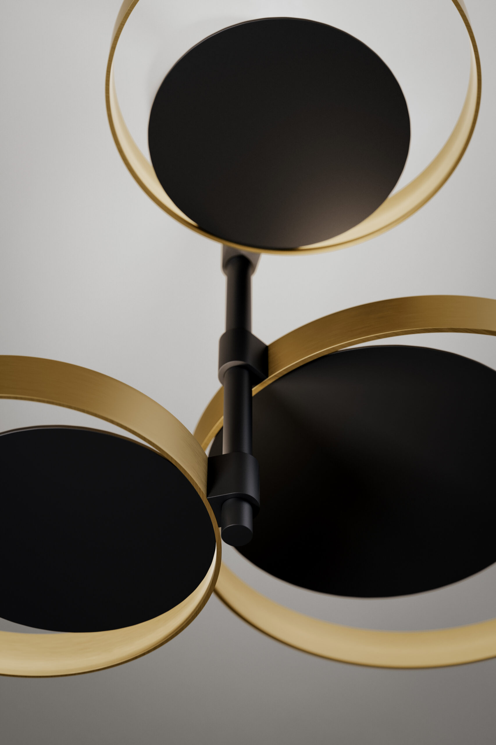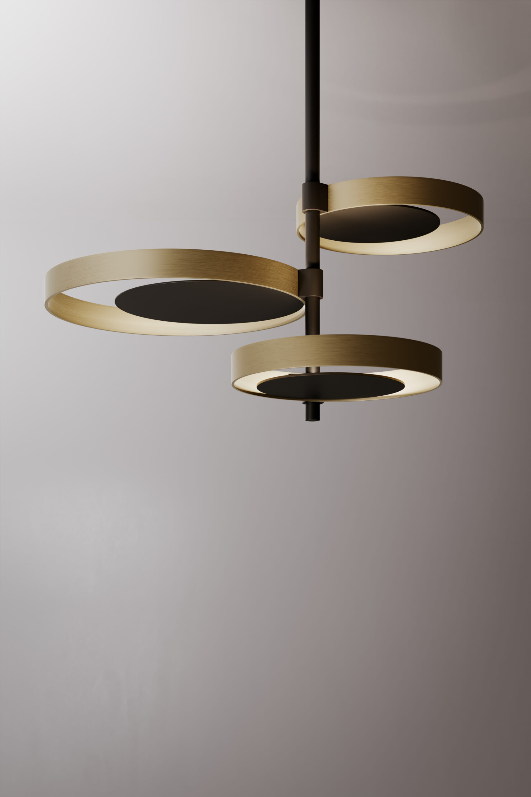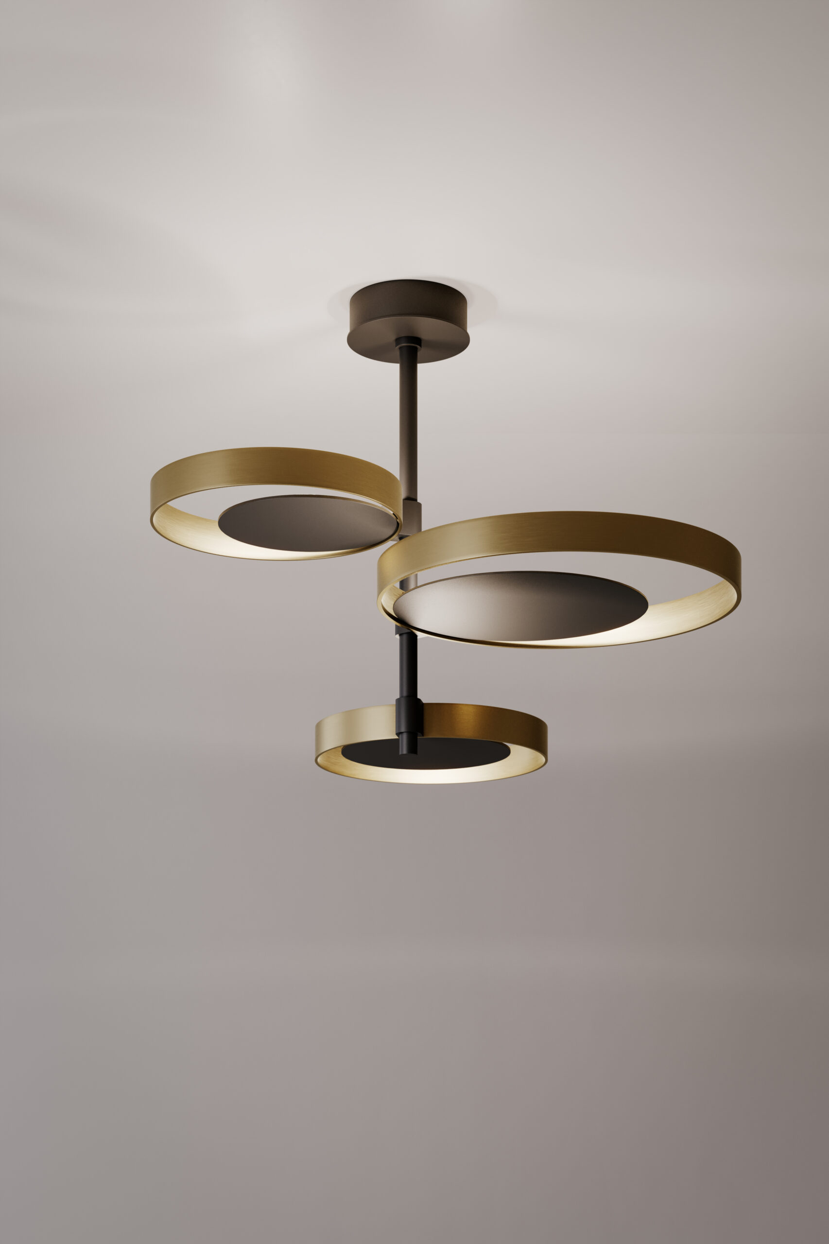 Ceiling lamp with indirect light. Light burnished brass rings and matte black nickel structure.