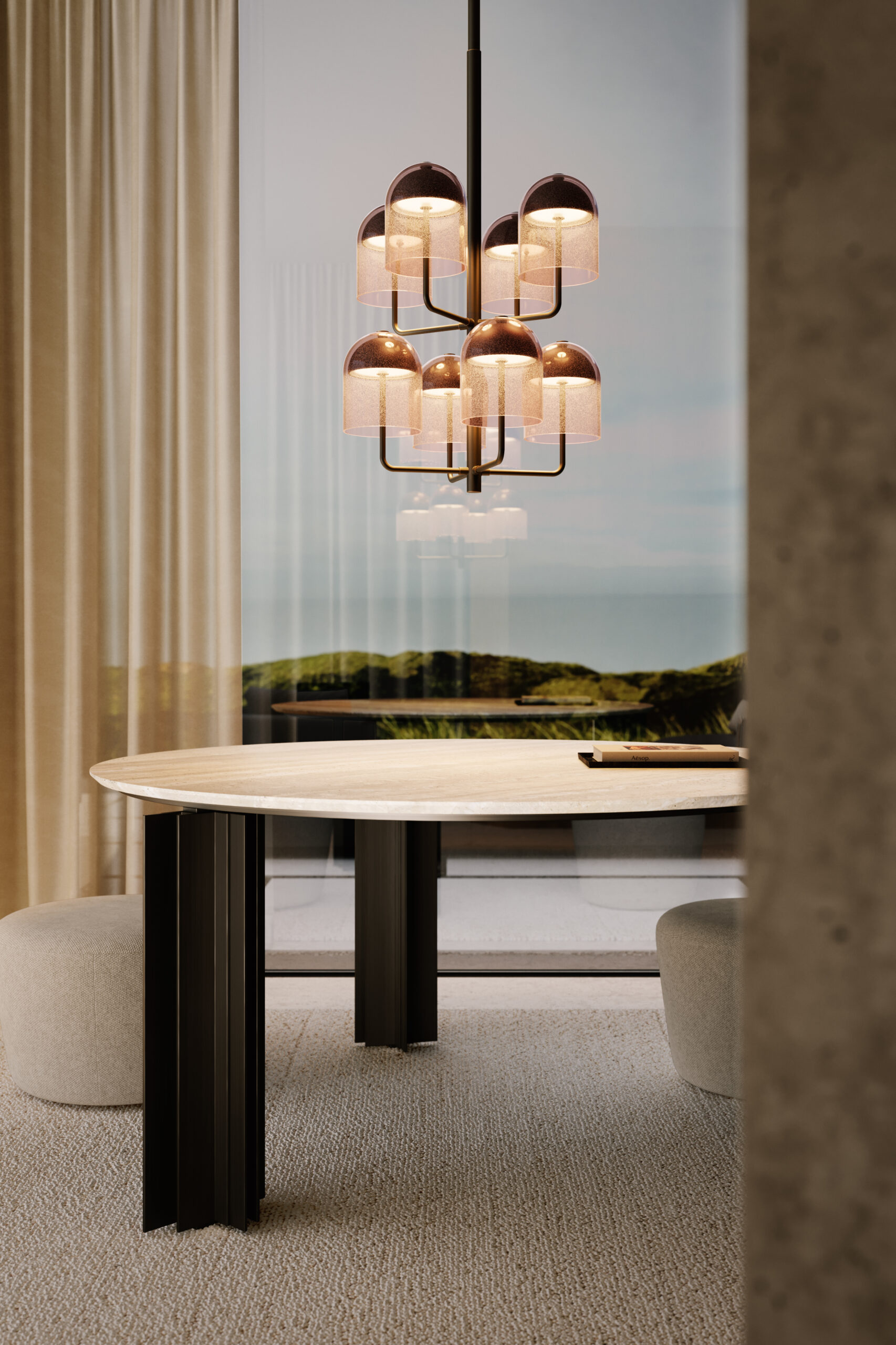 Suspended elements and quiet geometry shape Doma Chandelier’s presence. Light yet solid, it creates a captivating play of colored reflections through its eight Murano glass bell-shaped lampshades, supported by tubular metal arms. With its refined presence and indirect illumination, it brings elegance to interior spaces.