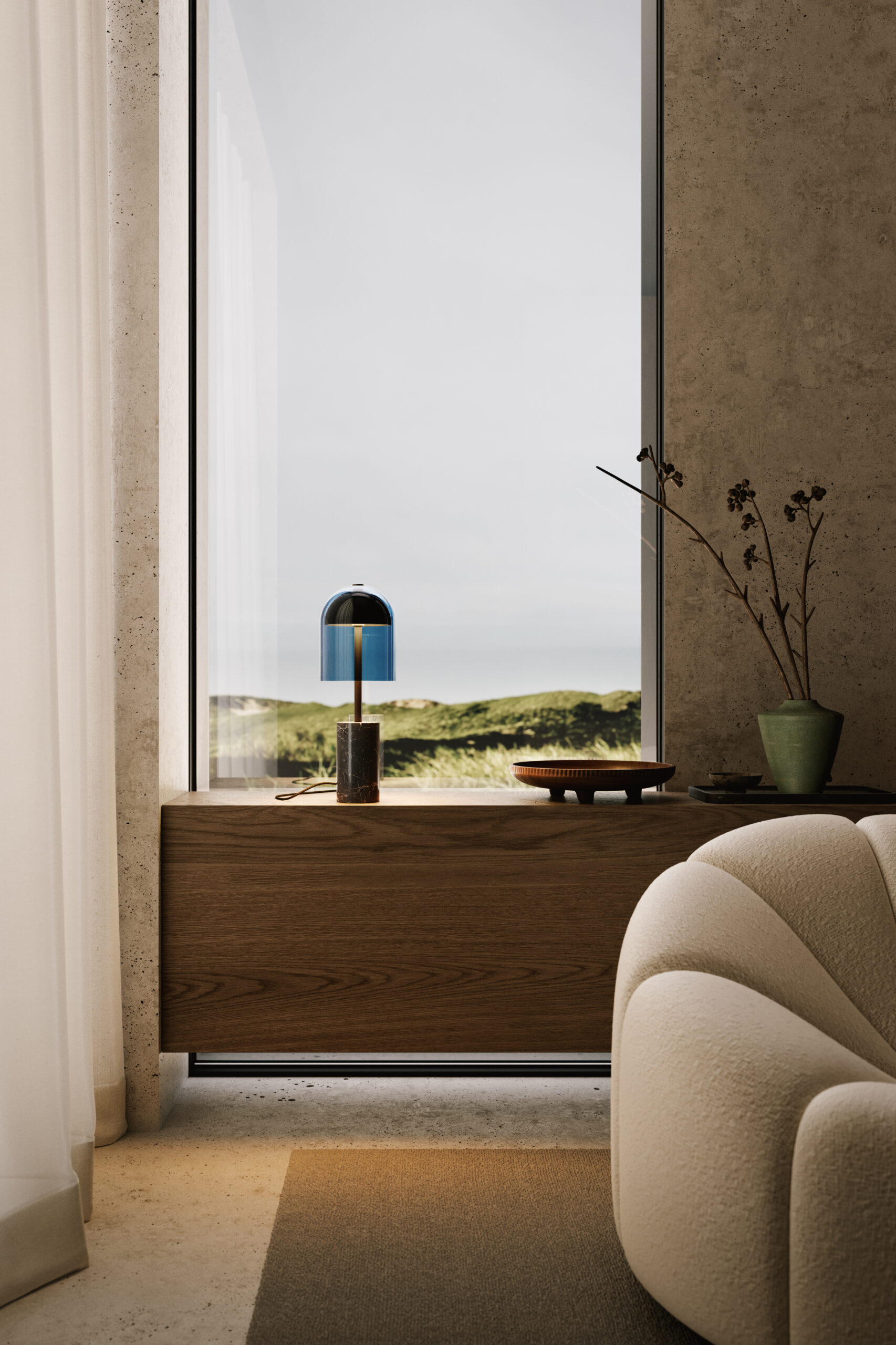 Pure forms and material contrast define Doma Table’s presence. The interplay between the Murano glass bell shade and the metal stem and base, available in stone or marble, creates refined sensory effects. The indirect light is softly adjustable via a touch dimmer located on the top of the glass shade.