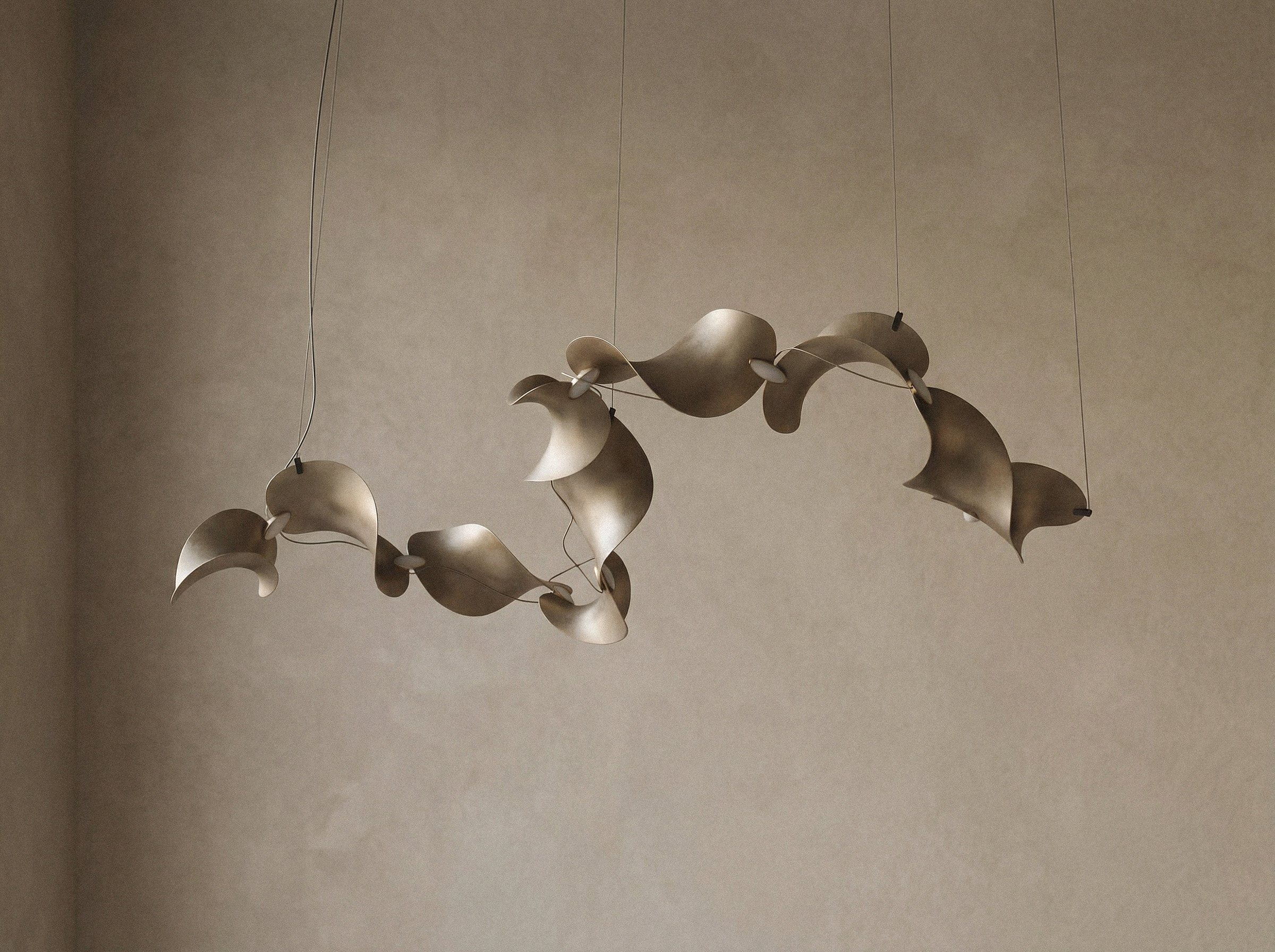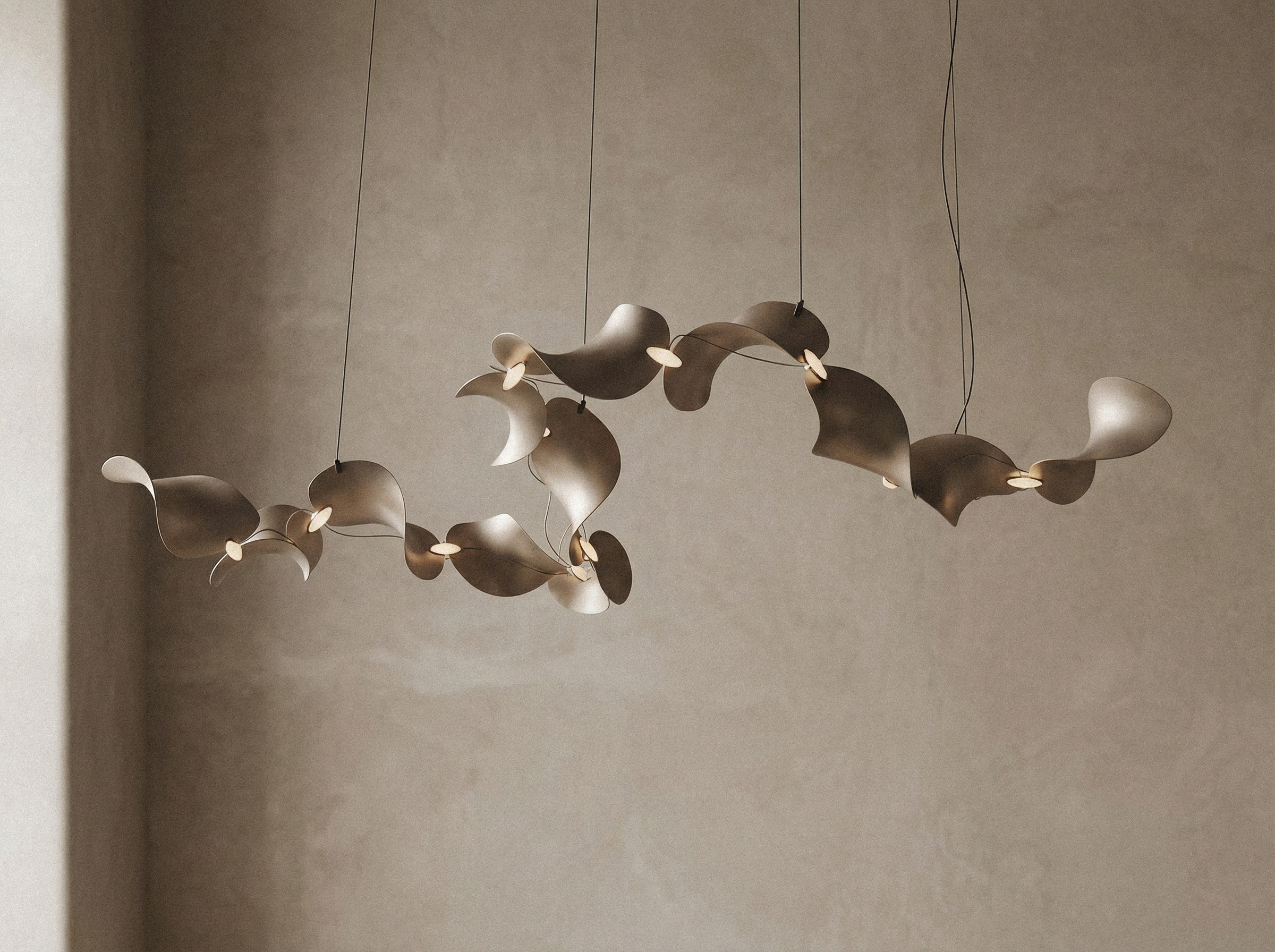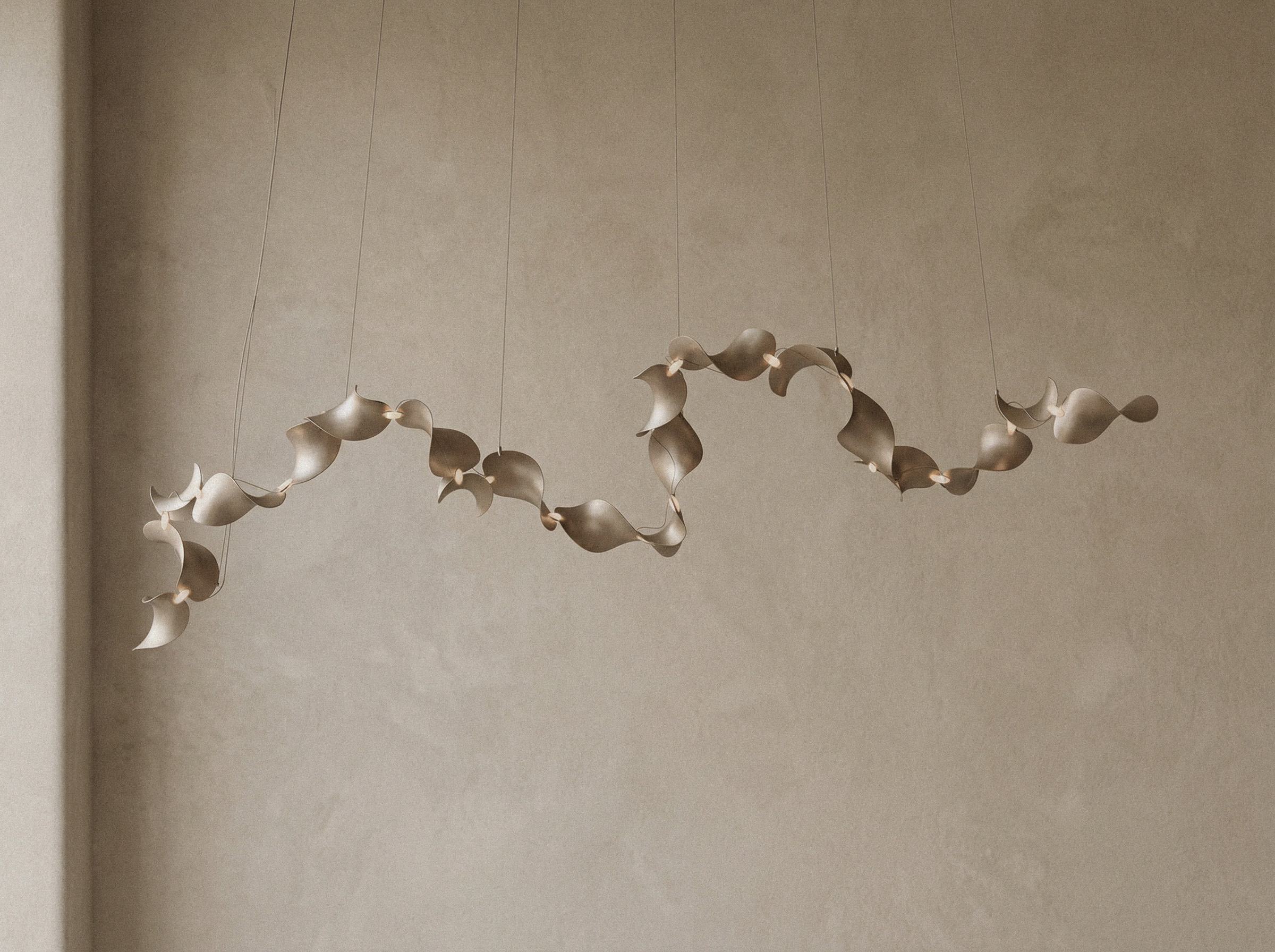DUNE Curve explores light as landscape. Designed by MOSS Objects, the modular system translates the fluid motion of wind-shaped dunes into a suspended composition of gently curved aluminium forms.