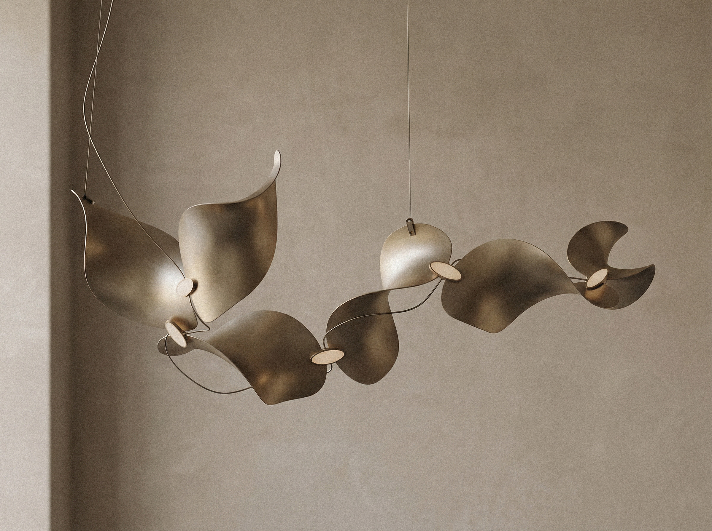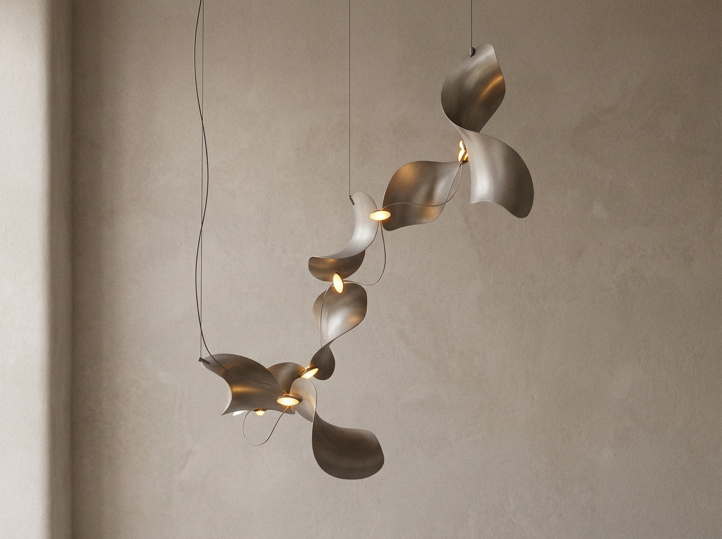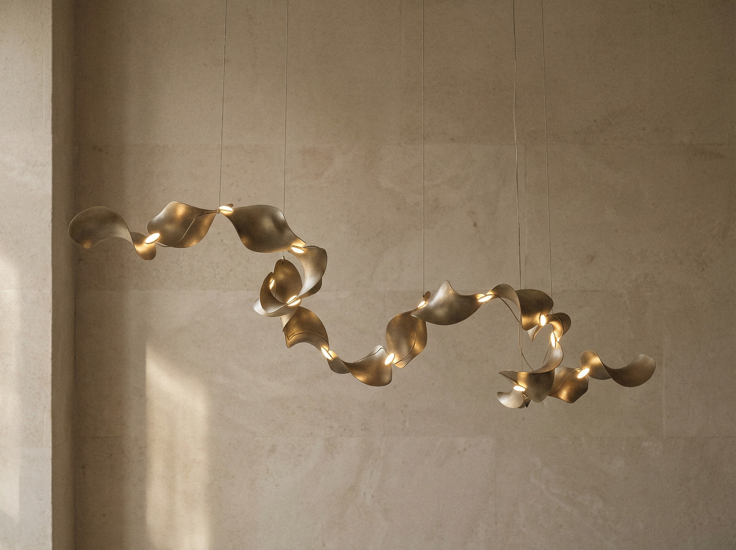 DUNE Curve explores light as landscape. Designed by MOSS Objects, the modular system translates the fluid motion of wind-shaped dunes into a suspended composition of gently curved aluminium forms.