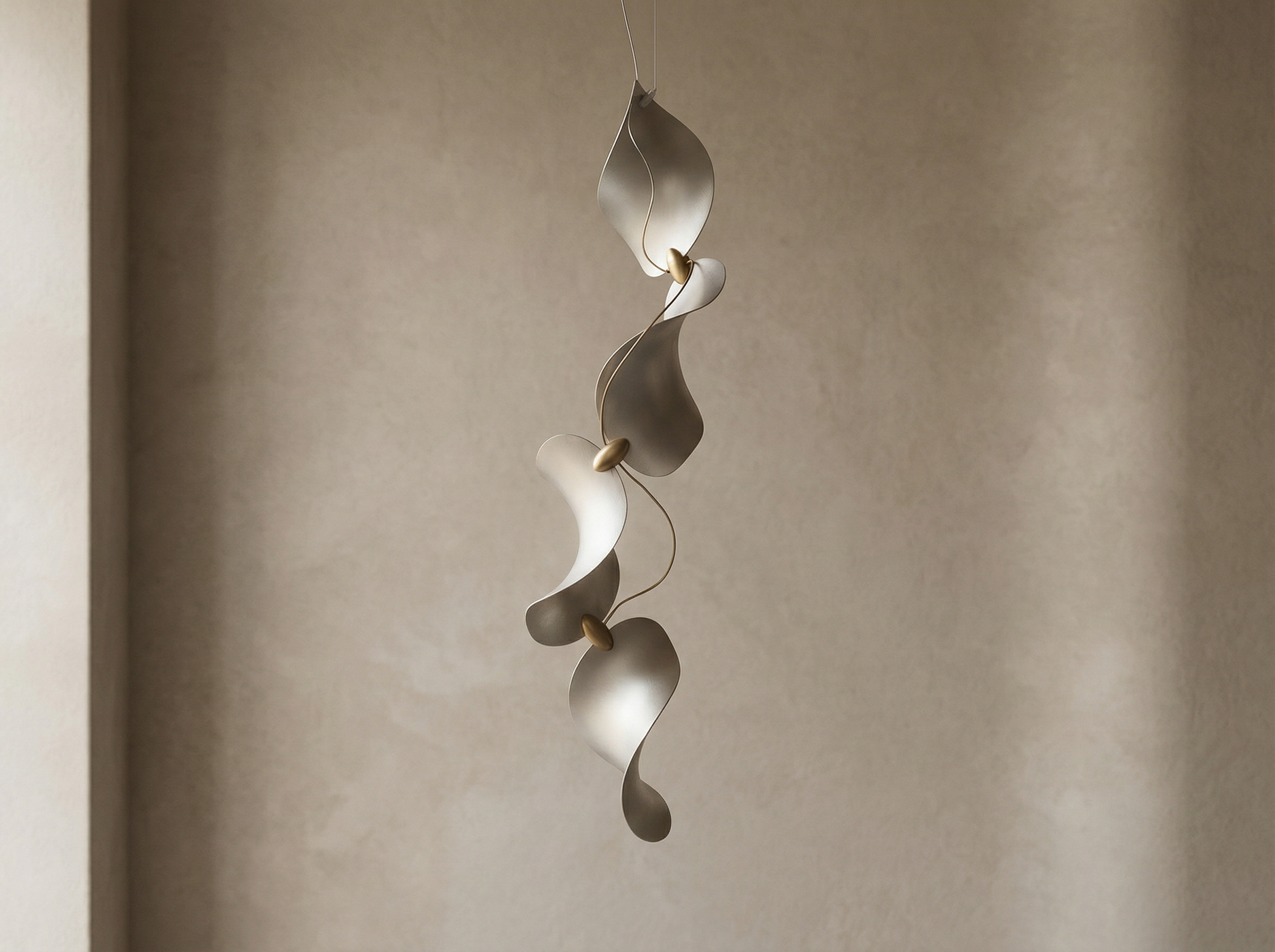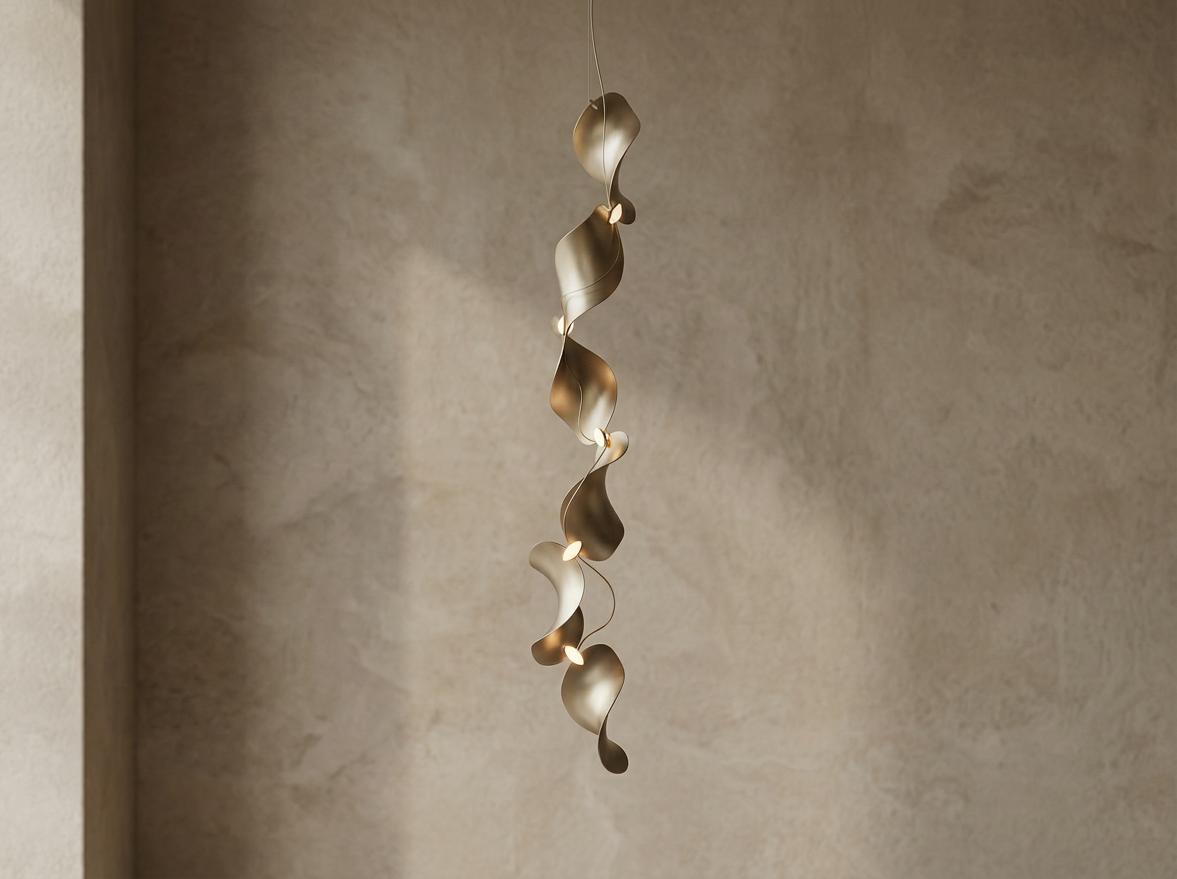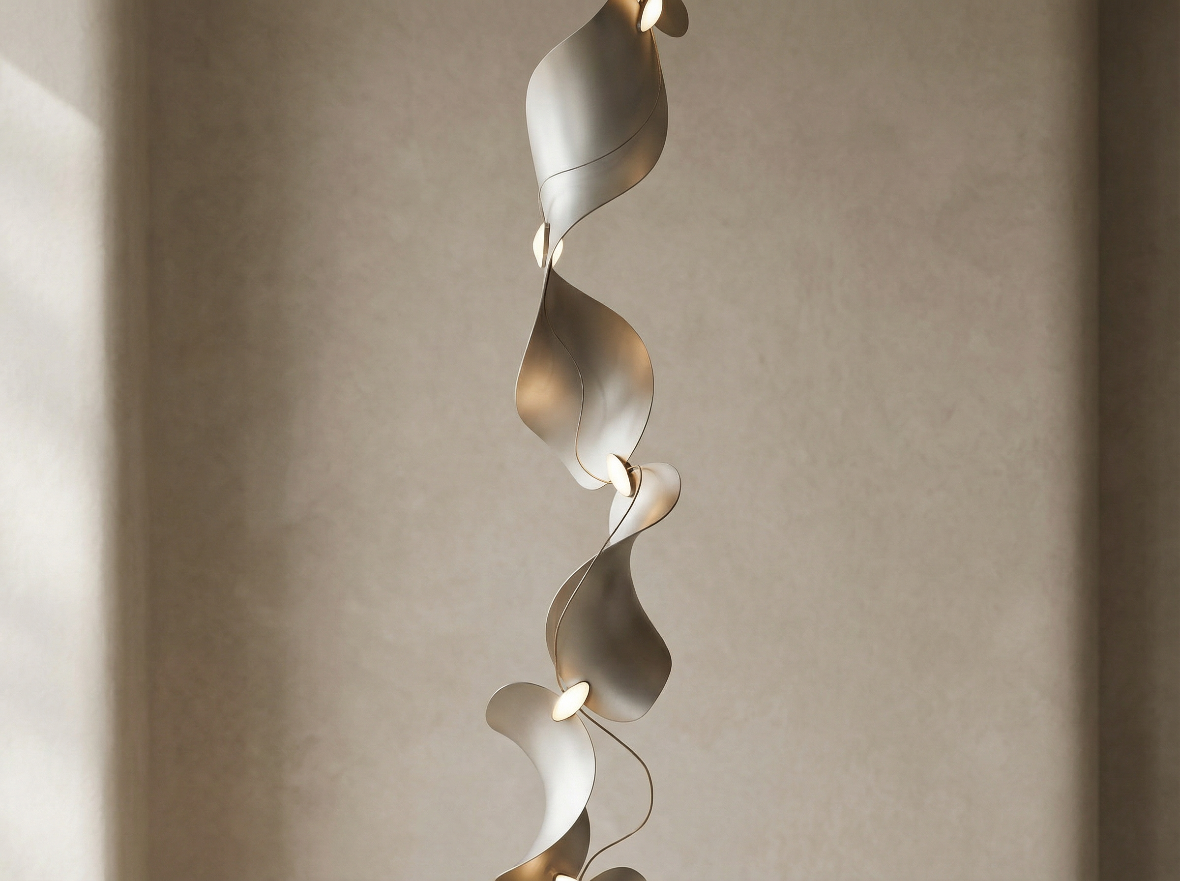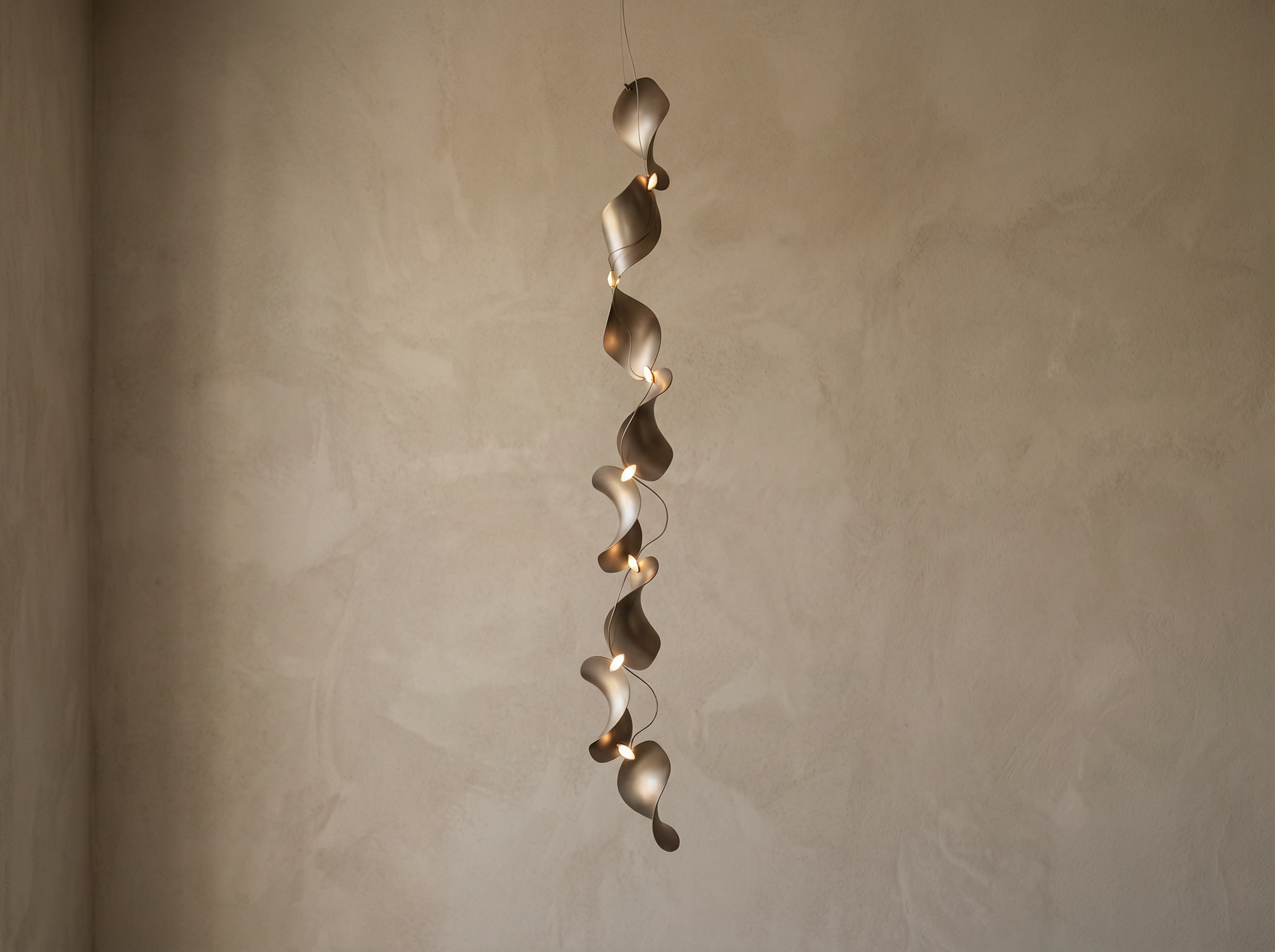 Configured as a sequence of gently curved aluminium elements aligned along a vertical axis, the luminaire twists subtly as it descends, creating movement while maintaining a refined, minimal profile. Its sculptural rhythm evokes wind-shaped dunes and the shifting interplay of light and shadow across their surfaces.