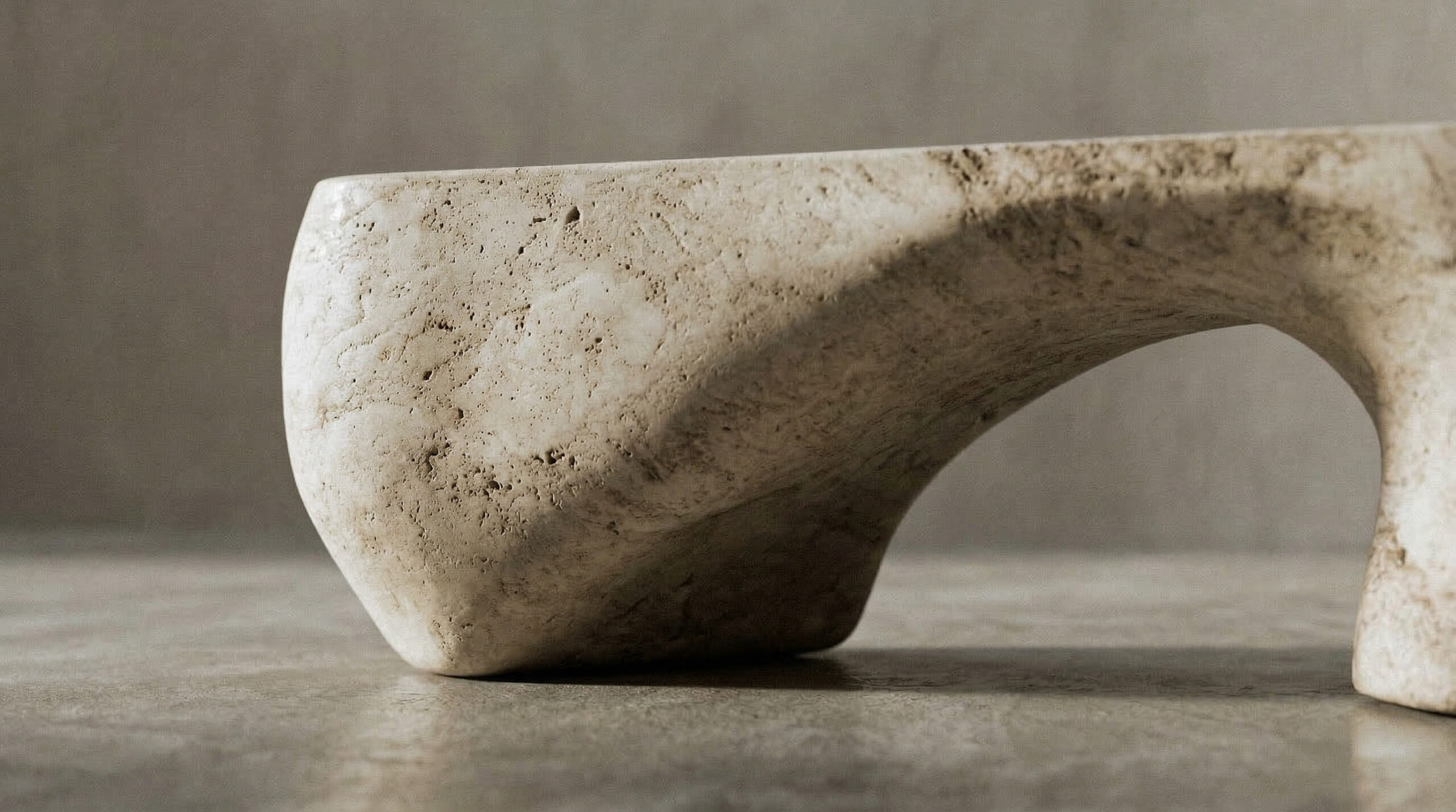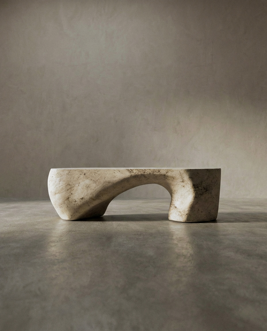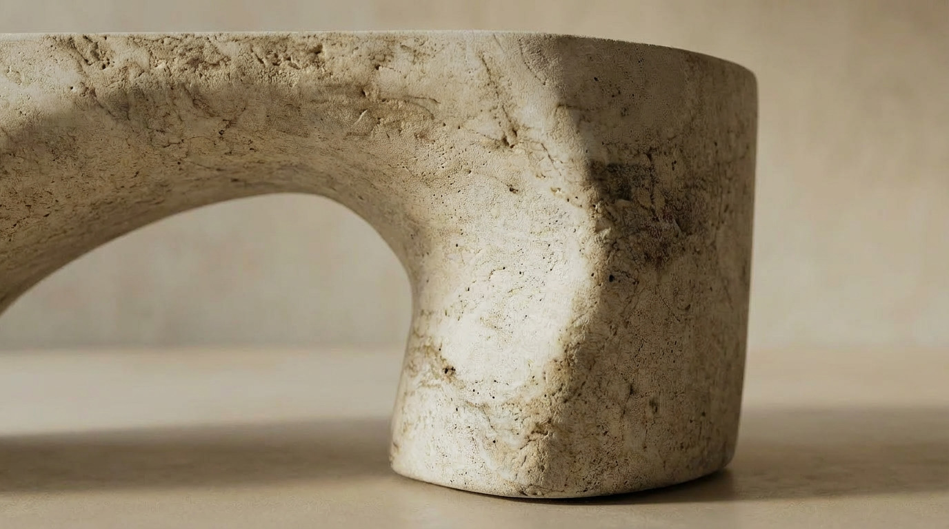 A gesture of stillness, Uir translates earth into form. Its elongated silhouette invites pause — to sit, to rest, to linger. Broad surfaces reveal travertine’s natural grain, while the grounding of the piece gives rooms a point of orientation. In hallways, bedrooms, or thresholds, Uir is not merely seat but resting place: body meeting ground.