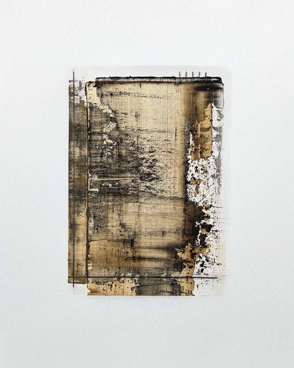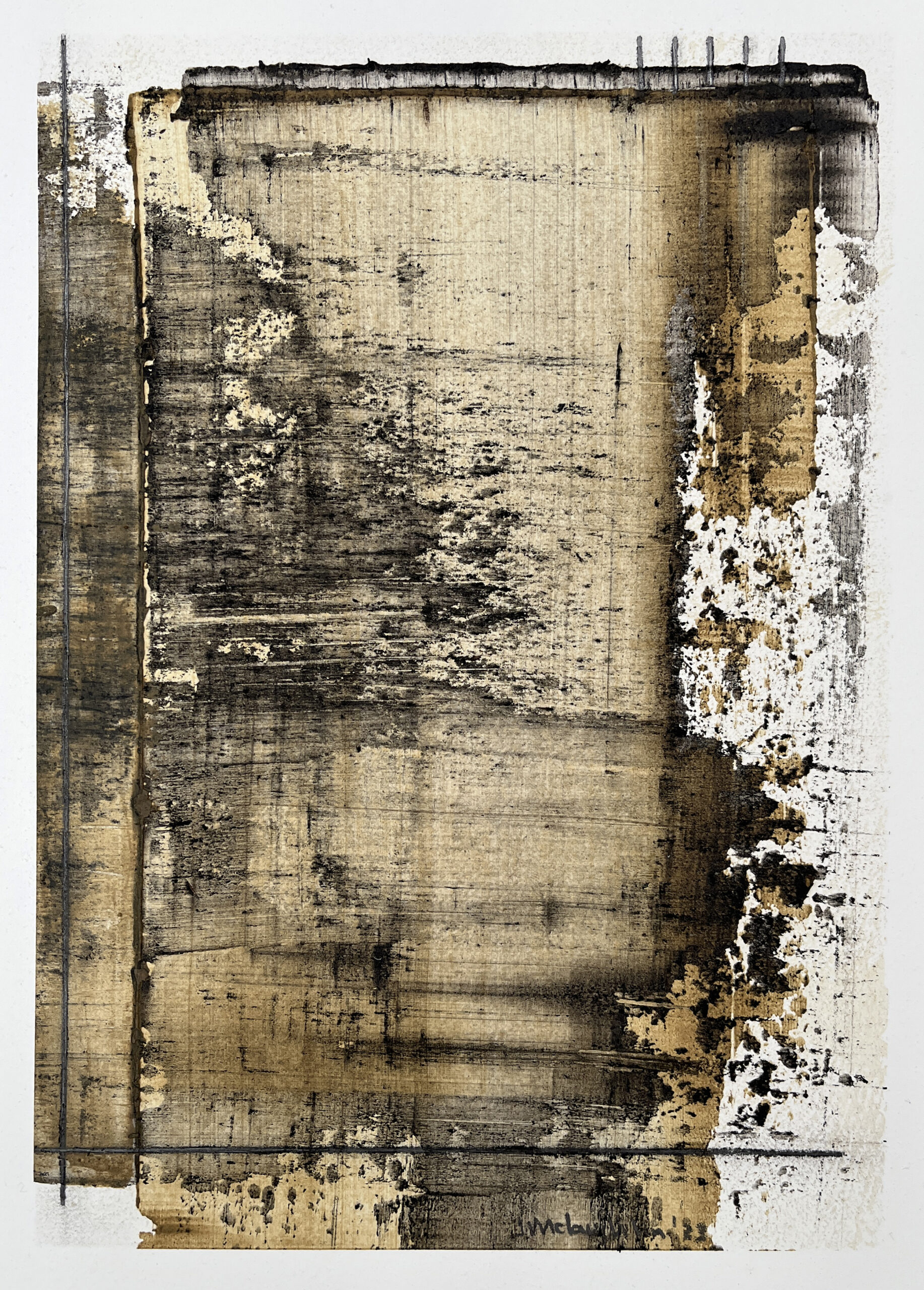 Work on paper using only layers of varied thicknesses of peat and willow ash to create tones and textures. Lines drawn with charcoal pieces taken from the fire.